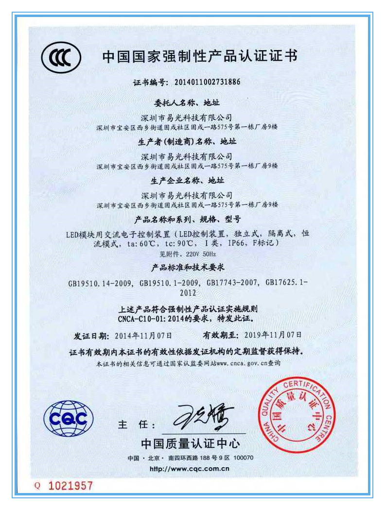 根據(jù)國(guó)家認(rèn)監(jiān)委發(fā)布2014年第23號(hào)公告,易光科技自2014年10月,申請(qǐng)了將260個(gè)型號(hào)的CQC證書(shū)轉(zhuǎn)換為CCC強(qiáng)制認(rèn)證證書(shū)。2014年11月獲得中國(guó)質(zhì)量認(rèn)證中心頒發(fā)的13個(gè)系列共260個(gè)型號(hào)的CCC證書(shū)。